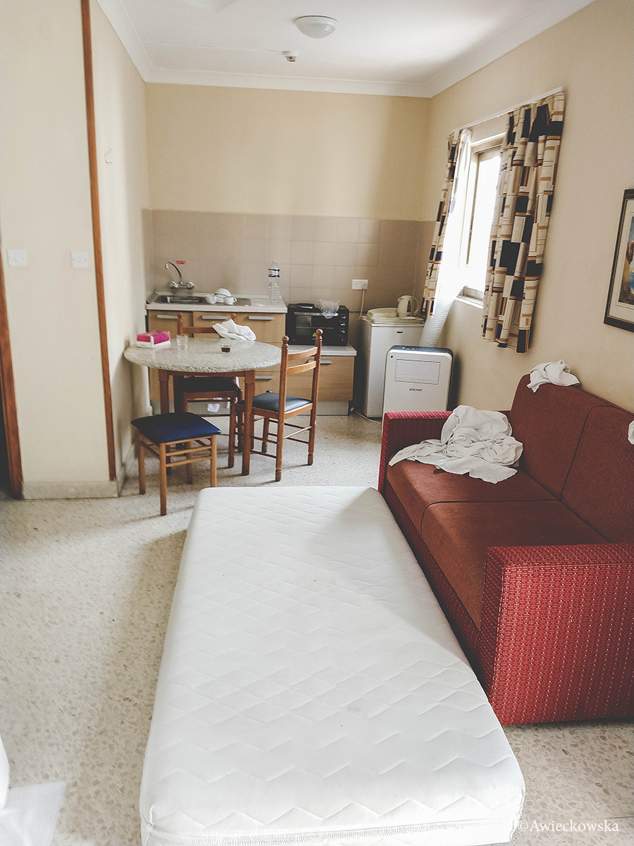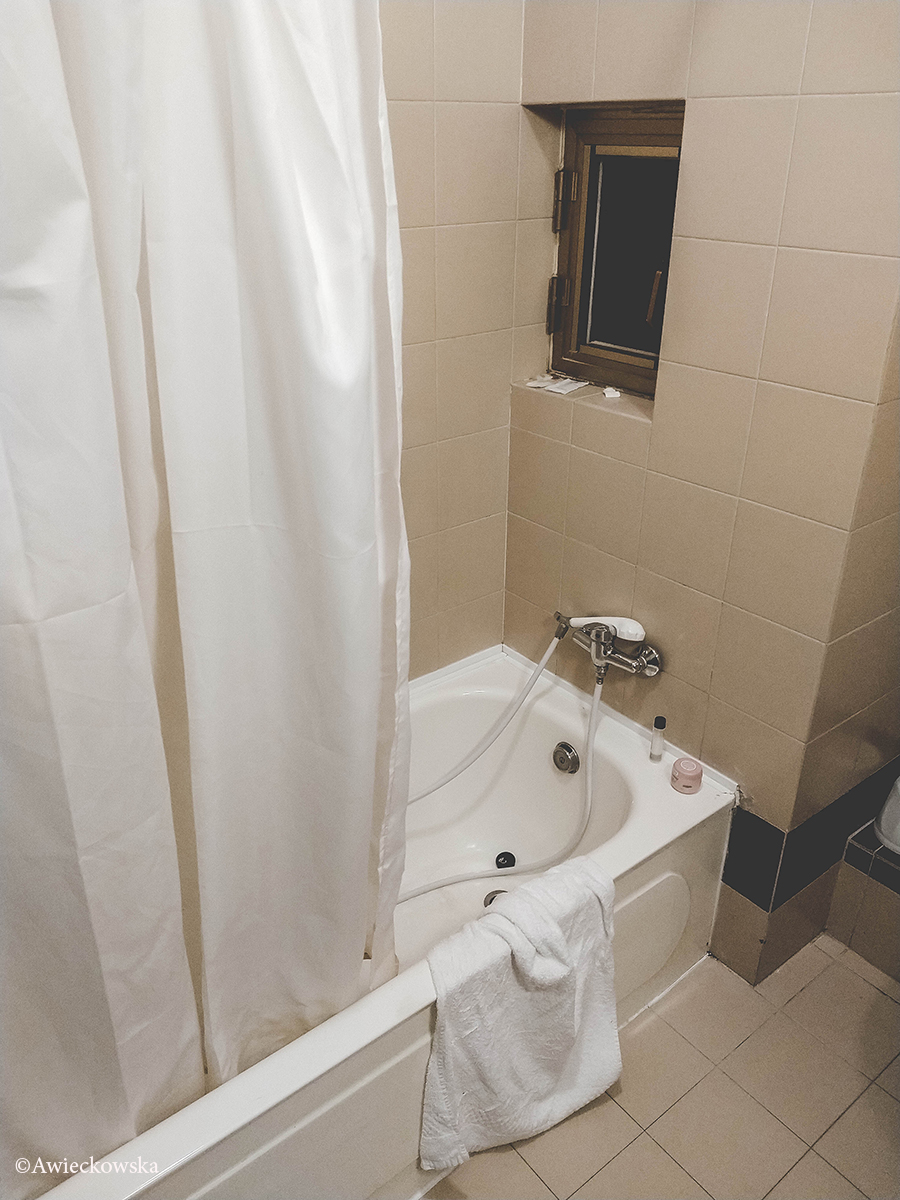 Hotel z zewnątrz wyglądał przyzwoicie, za to w środku wszystko wyglądało, jakby się miało rozlecieć. Do wind strach było wejść i faktycznie po dwóch dniach na jednej wisiała kartka, że jest zepsuta. Pokój wyglądał tak, jakby zaraz wszystko miało się rozlecieć. W łazience za wywietrznik służyło okienko do komina. Z drugiej strony dokładnie takie samo okienko mieli sąsiedzi z pokoju obok. Trzeba było pamiętać, żeby je zamykać, w przeciwnym razie sąsiedzi z naprzeciwka mogliby mieć ciekawy seans. Po otwarciu okienka w nozdrza uderzał „zapach” grzyba. Ten zapaszek zresztą czuć było w całym apartamencie.