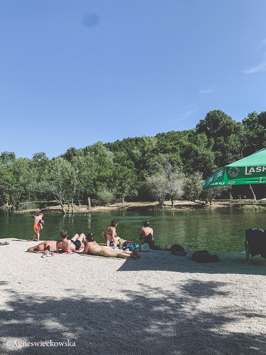Gorąco było, więc pomyśleliśmy, że fajnie by było gdzieś nad wodę żeby Mała się popluskała. Padło na wodospady Kravica, przy których byliśmy pięć lat temu. Nie wiem, czy to był dobry pomysł. Miejsce strasznie się skomercjalizowało. Kiedyś była jedna knajpka sklecona naprędce i gliniasty brzeg. Teraz brzeg wysypali ostrymi kamykami. Postawili hipsterską restaurację i zorganizowali rejsy pod wodospady. Wszystko oczywiście za jakąś kosmiczną cenę. Gdybym wiedziała, ile teraz kosztuje wstęp do parku, to bym się mocno zastanowiła nad tą atrakcją. Skończyło się tak, że przy wodospadach była zbyt lodowata woda na pluskanie, a do tego dosyć ostre zejście do wody. Nie było wydzielonej części dla dzieci. Nasza Hrabinia nie lubi kąpać się w zimnej wodzie, więc skończyło się na małym pluskaniu w rozlewisku powyżej wodospadu.